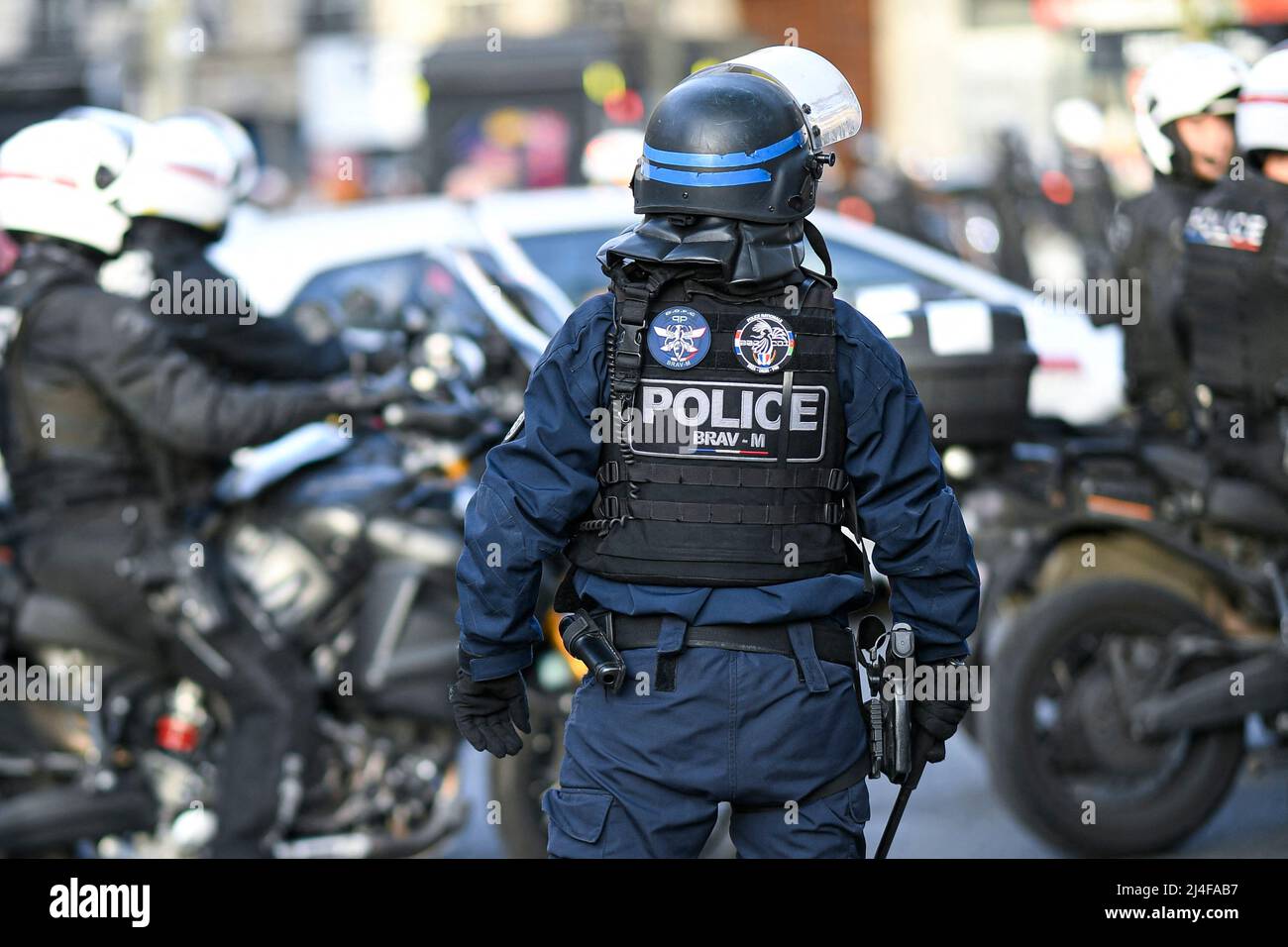Ein Polizist Von Hinten Crs Brav M Franzosische Polizei Wurde Wahrend Eines Aufruhrs Bei Dem Sich Studenten Am 14 April 2022 Vor Der Sorbonne Universitat In Paris Versammeln Auf Der Strasse Eingesetzt Um Die